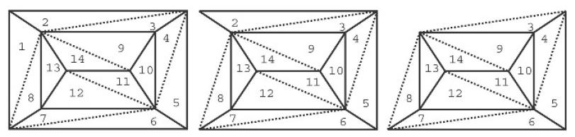 Poi rimuoviamo i triangoli partendo dall'esterno: ci sono due casi: 1) se il triangolo ha un solo spigolo a contatto con l'esterno, si rimuove questo spigolo e quindi anche il triangolo, perciò P+V-S non cambia; 2) se due spigoli sono a contatto con l'esterno, rimuoviamoli e così perdiamo un triangolo e un vertice, ma in ogni caso P+V-S non cambia. Alla fine rimarrà un unico triangolo per il quale P=1, V=3, S=3 e P+V-S=1 e questa relazione vale anche per il grafo iniziale; ricordando che P=F-1, viene F-1+V-S=1 e quindi F+V-S=2.